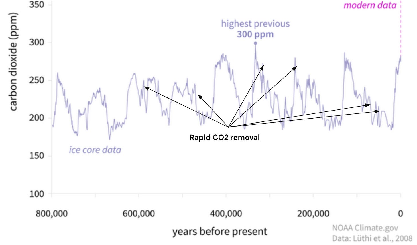 Fig. 1. CO2 levels over 800,000 years showing repeated removals of 50 to 130 ppm. One ppm corresponds roughly to 10 Gt of CO2. Thus 50 ppm is almost 500 Gt.