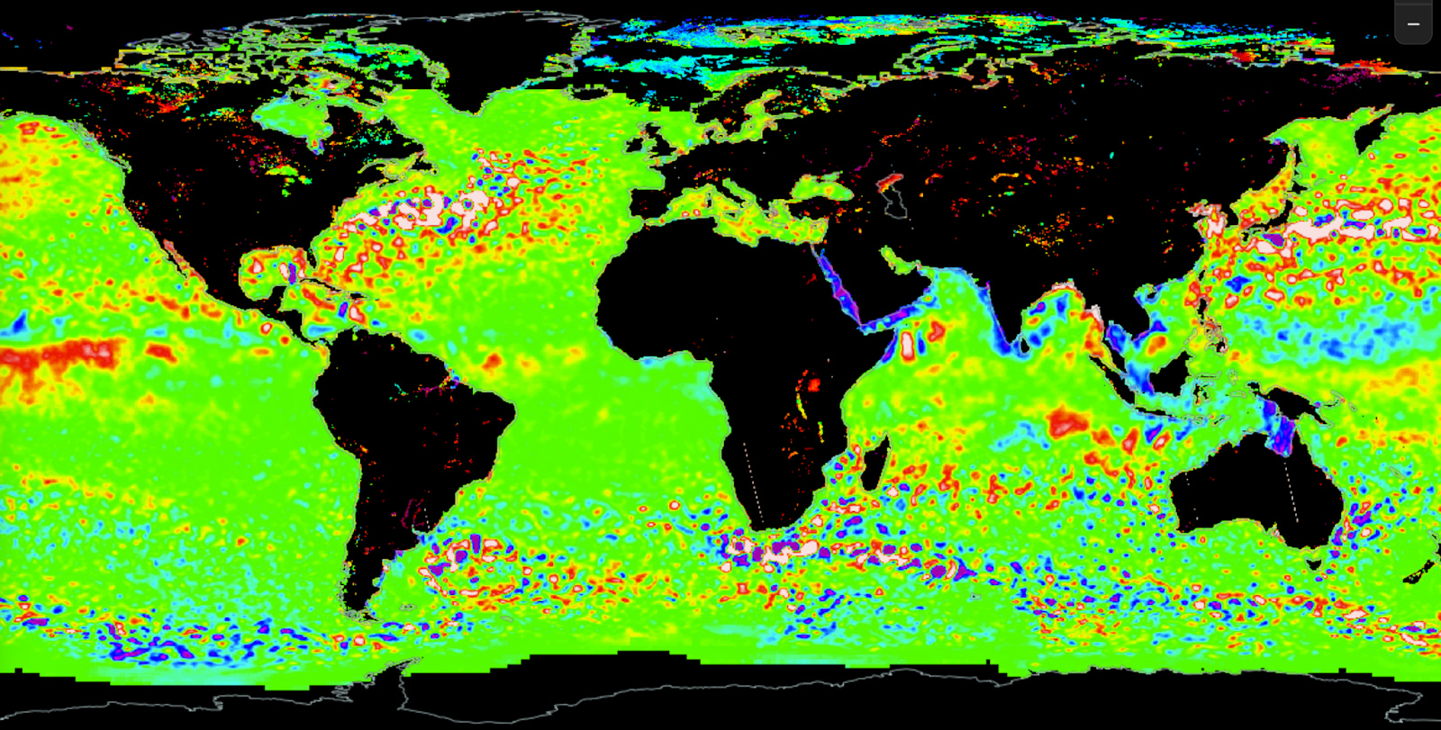 See the header image for a NASA satellite map of ocean eddies. Blue dots represent downwelling eddies; red, upwelling.