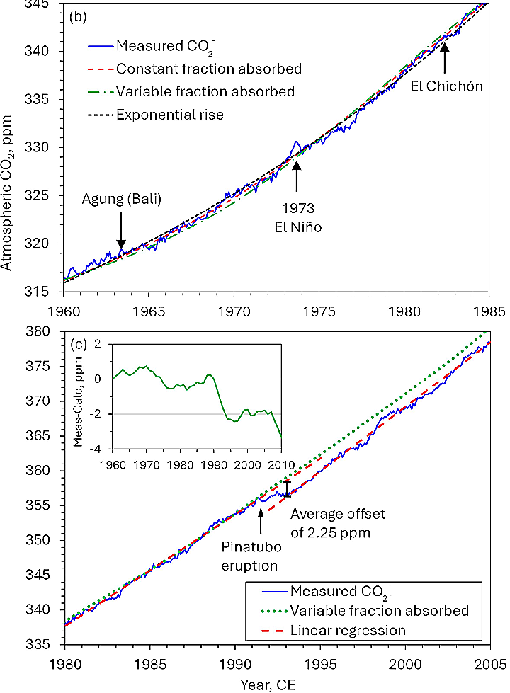 Fig. 2. The lower panel compares actual CO2 levels measured at Mauna Loa (solid blue) with expected CO2 levels (dotted green). The discrepancy indicates long-term removal of 2.25 ppm of CO2. The upper panel shows that two eruptions of similar size and global cooling impact, Agung (1963) and El Chichon (1983) led to no persistent CO2 removal. (Fiekowsky and Burnham, 2025)